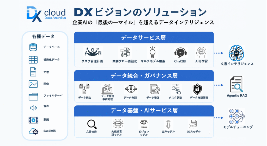 DXビジョンは創業当初から全員がデータサイエンティスト×フルスタックのマインドで、次世代データ基盤づくりに取り組んできました。鍵は「AI-Readyなデータ資産」をいかに素早く、正確に、そして安全に供給できるかです。