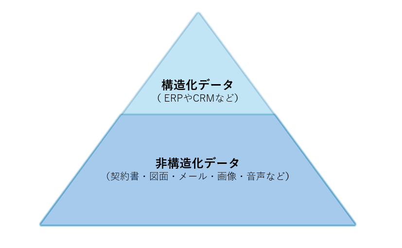 - 水面下(約70%):契約書・図面・メール・画像・音声などの非構造化データは、AI時代の「燃料」だが、部門やSaaSに点在しデータサイロ化